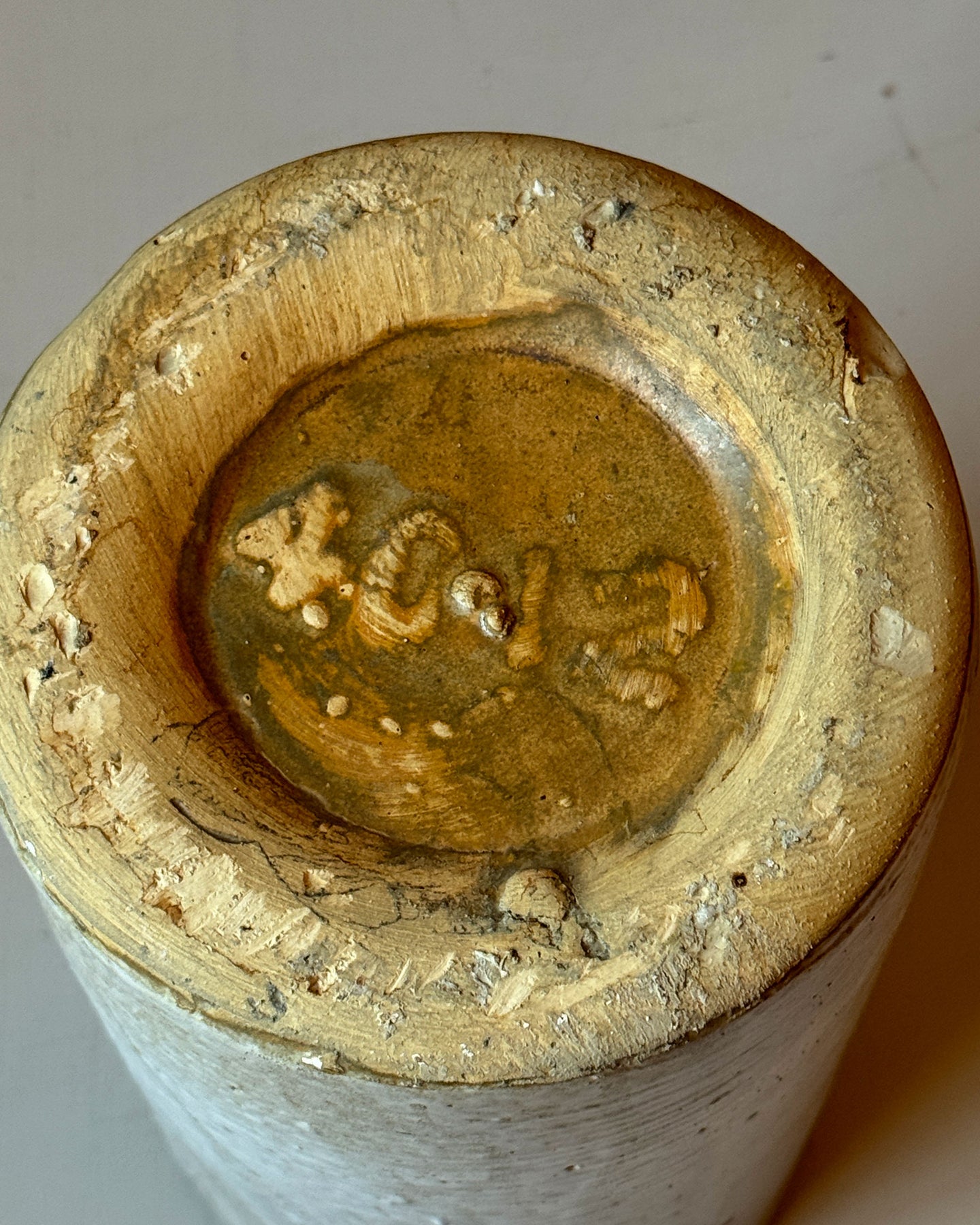 A tall, cylindrical stoneware vase from Zanesville’s 1960s Homespun (Stone Age Modern) line, featuring a subtle ribbed texture and softly variegated taupe-and-ivory glaze. Its clean, modern silhouette paired with the warm, earthy finish captures the effortless organic elegance of mid-century American ceramics. Perfect for branches, blooms, or display on its own, this piece brings timeless, handcrafted character to any room.