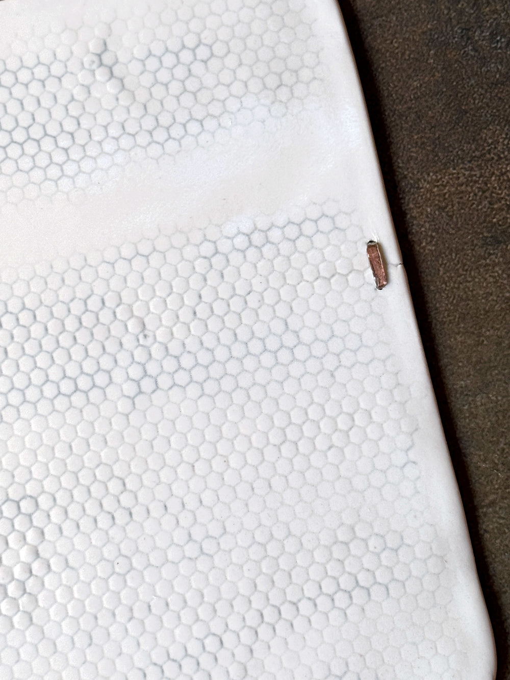 Bright white gloss layered with a soft, pale grey wash that settles into the texture, leaving raised areas luminous and the pattern crisply defined. We work the grey into the surface and wipe it back before glazing, so the hexes of Honeycomb and the grain of Birch read with quiet dimension. Mixed in small batches in our studio, this glaze naturally varies—tiny specks, tonal shifts, the way the wash gathers. No two applications are exactly alike.
