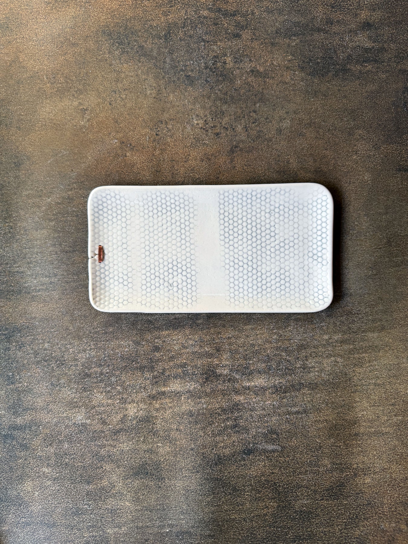 A slim rectangular porcelain plate impressed with our softly patterned honeycomb motif. The low rim and softly rounded corners keep it quietly refined, just right for bread and butter, a handful of olives, or a few chocolates. Off the table, it’s a graceful catch-all on the bedside or bath counter, and it tucks neatly beside the sink for a sponge or by the stove for herbs. Stacks cleanly and layers beautifully with the rest of Honeycomb.